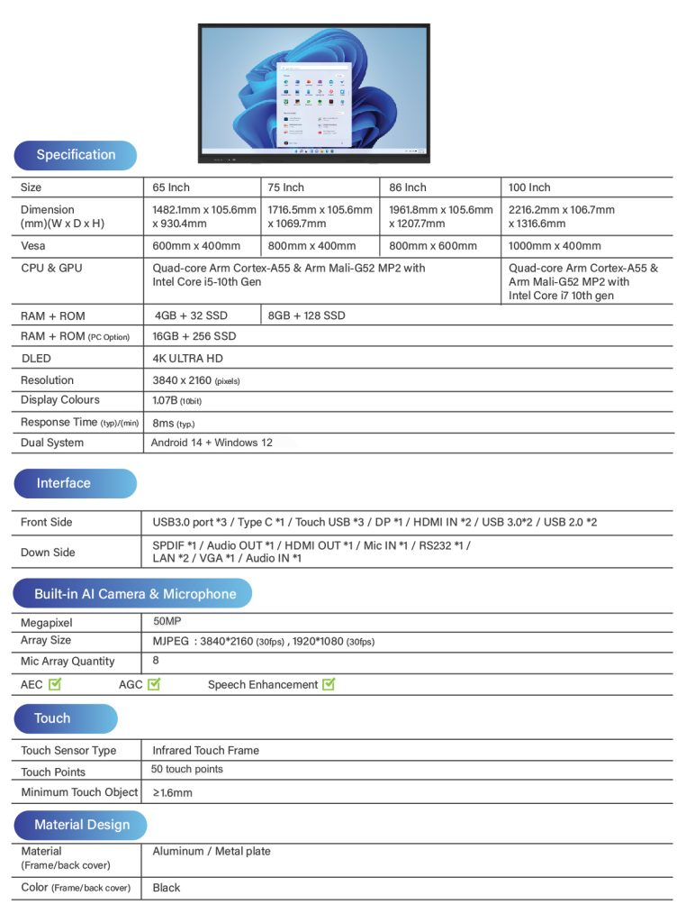 Are you tired of the limitations of traditional blackboards? Upgrade your teaching, presentations, and public speaking with our state-of-the-art 65-inch 4K Interactive Whiteboard! Designed for Malaysia’s educational workers like teachers, tutors, and public speakers, this smartboard will take your classroom or presentation to the next level.