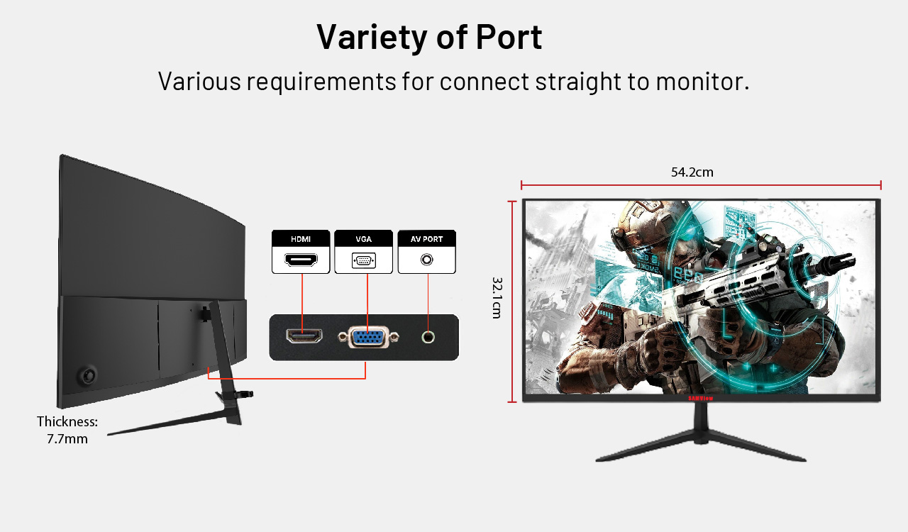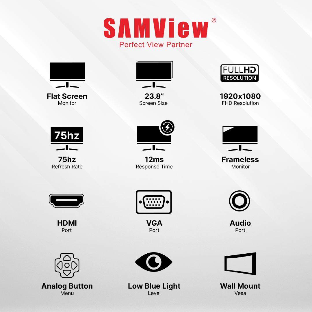 Samview bringing the most affordable yet high quality led monitor for SOHO use. Samview led monitor carry free sync up to 75Hz and reduce flicker free that save your eye sight, especially for children and kids nows a day need to focus so much time on computer. With its blue ray reduction, the kids can be safe for eye harming.