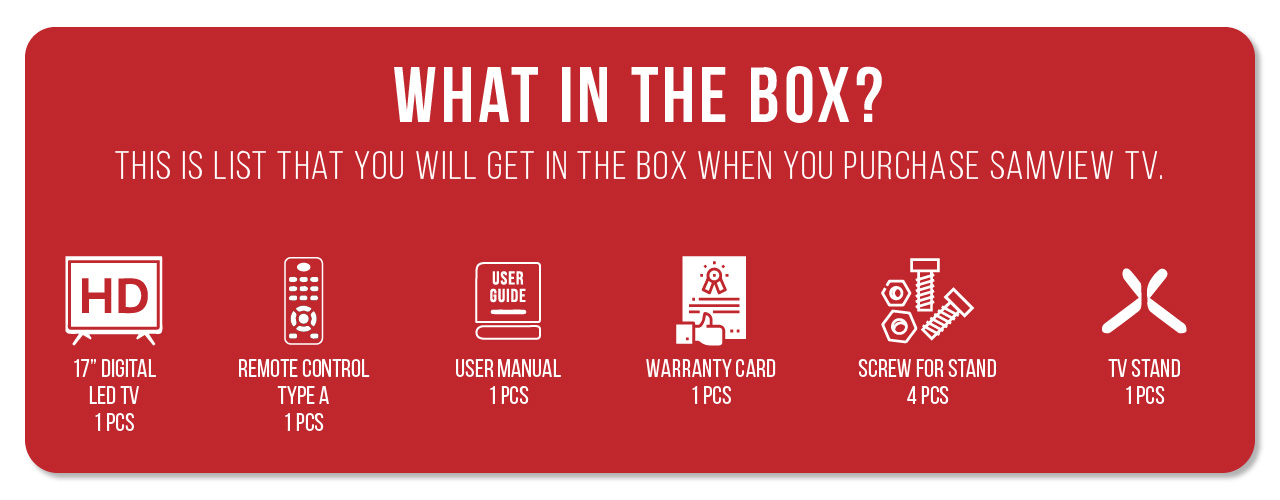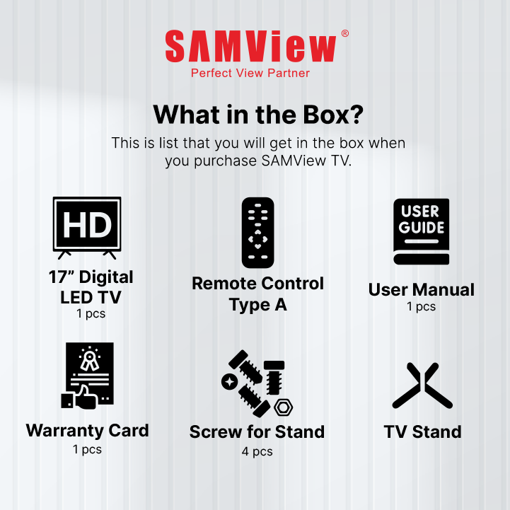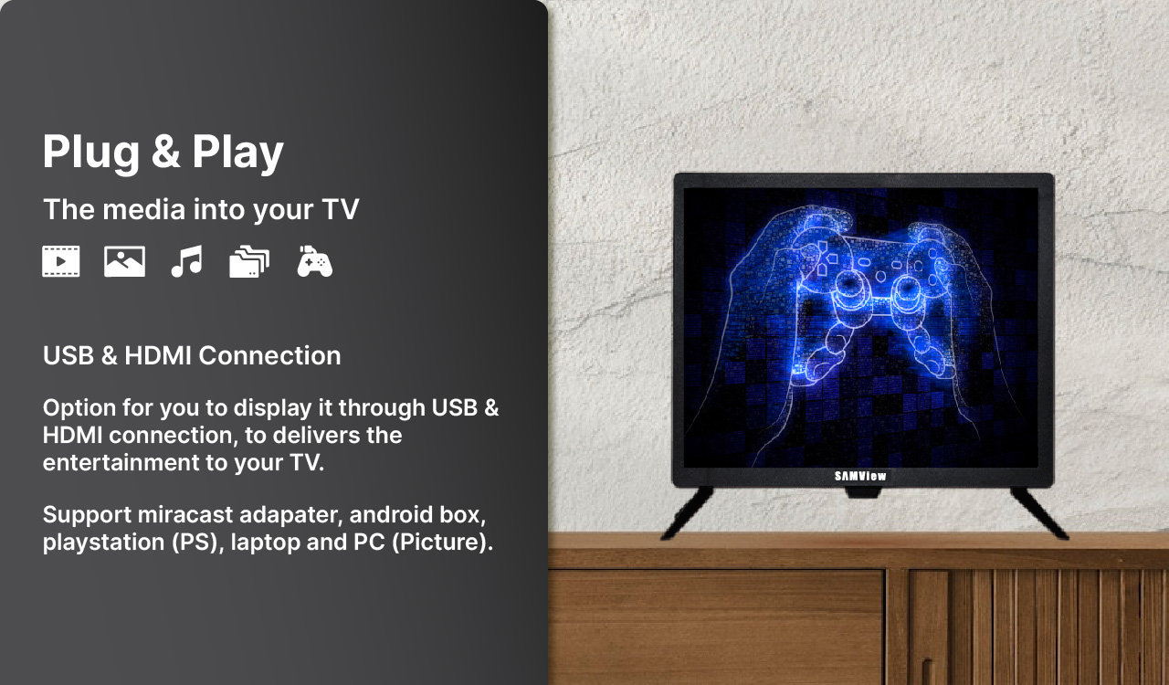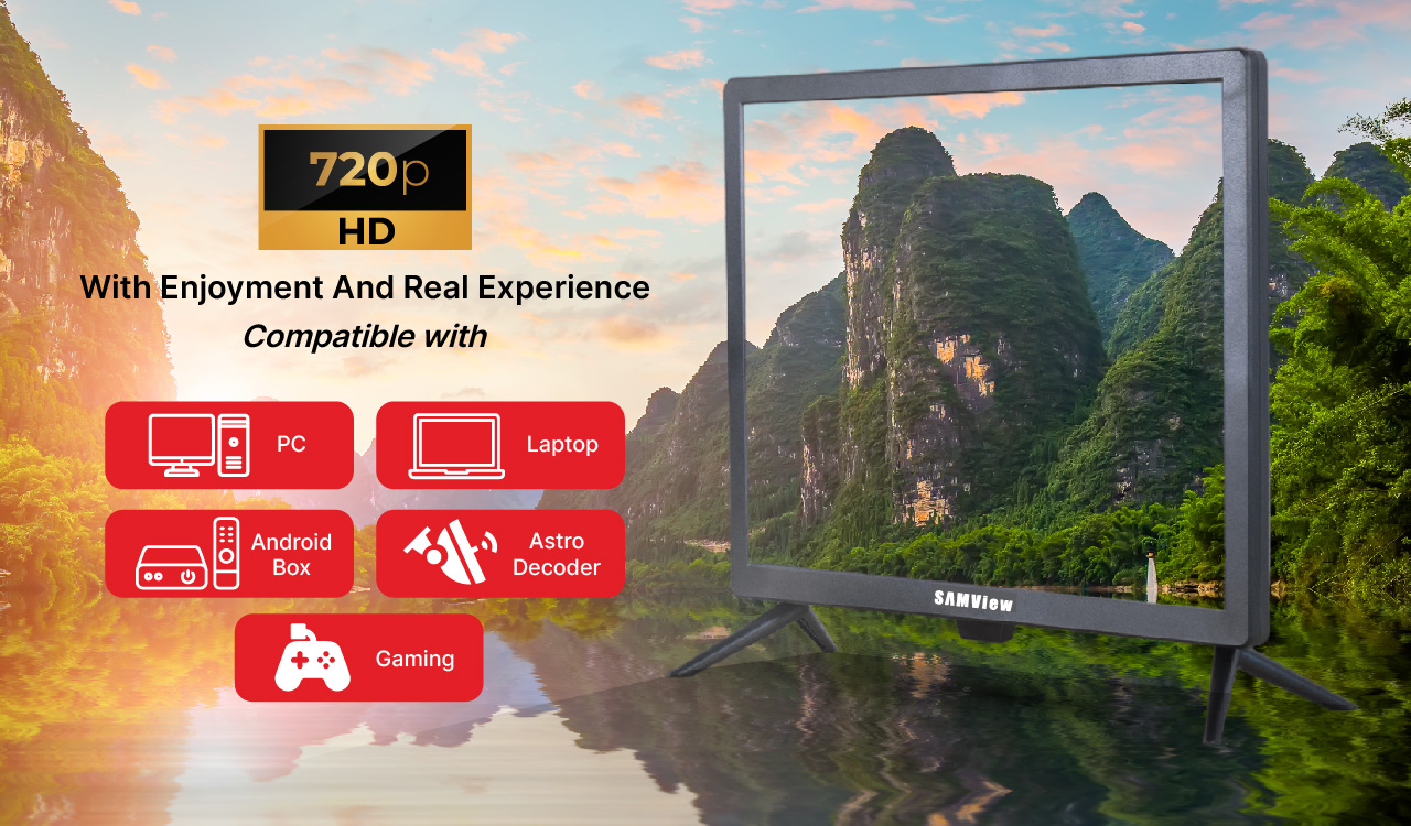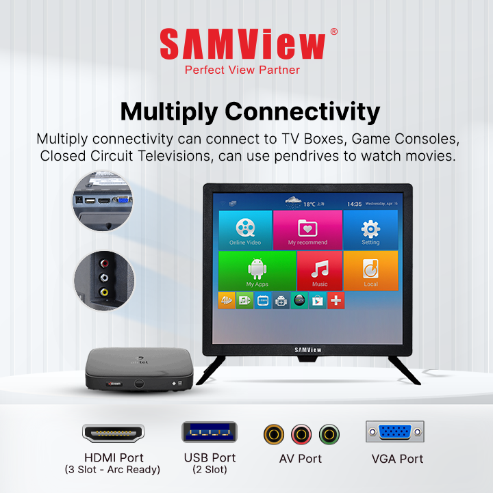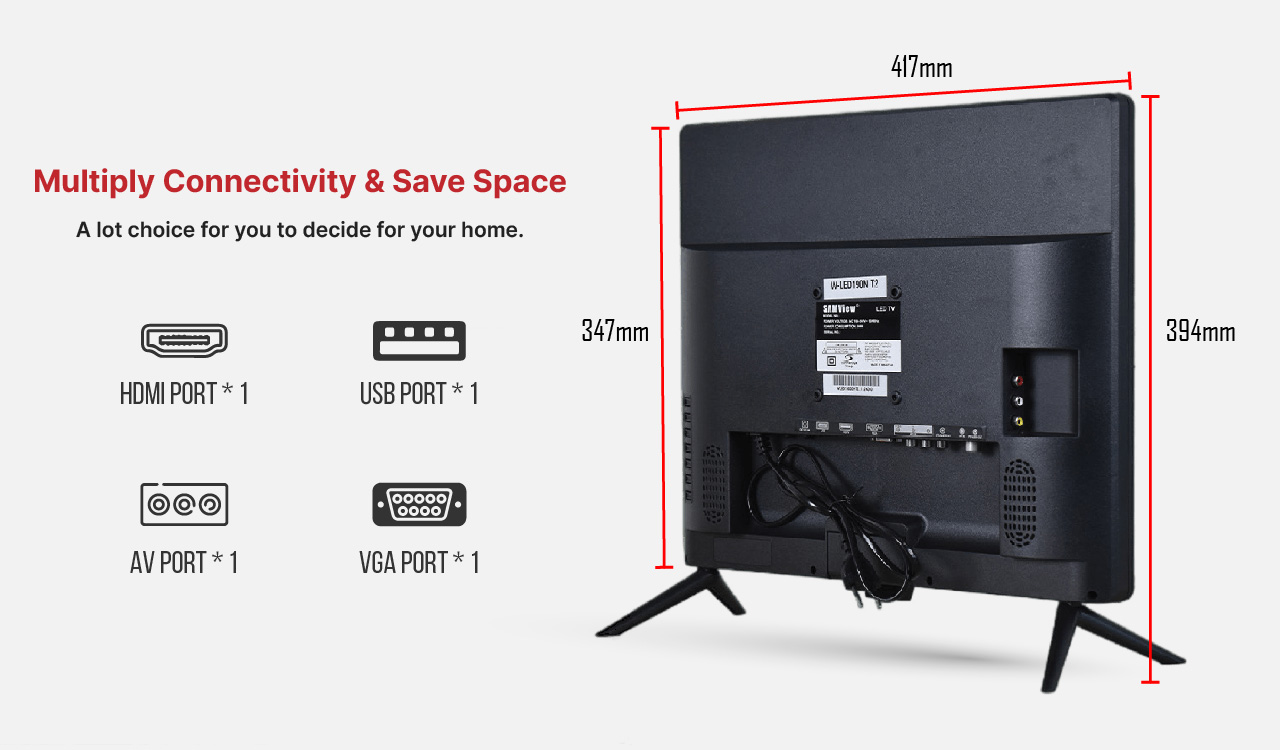 SamView LED TV comes with a 2 feet elegant stand design and VESA Wall Mount support. With an automatic energy saving features, it will even safe power with a handy setting that turns off the TV when idle stage.